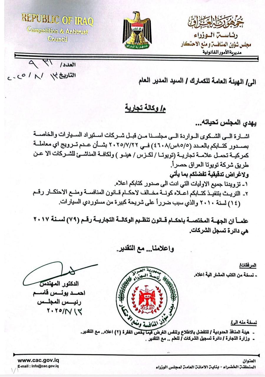 مجلس شؤون المنافسة ومنع الاحتكار يرسل طلب بشان الوكالات التجارية