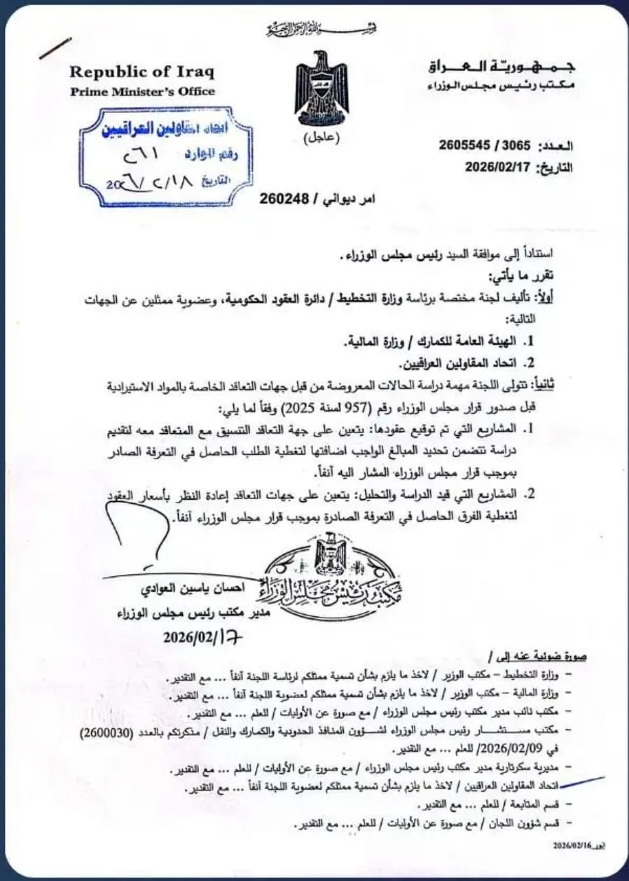 امر ديواني استنادا الى موافقة رئيس الوزراء تقرر تاليف لجنة مختصة برئاسة وزارة التخطيط / دائرة العقود الحكومية تفاصيل الارشيف